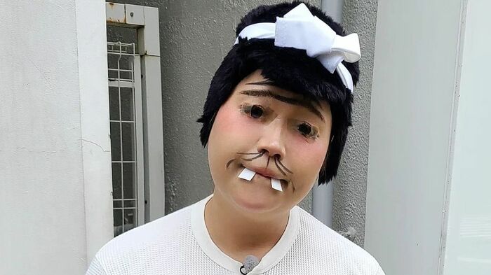 アニメでは黒丸で描かれている目を再現すべく、自らの目をベージュのテープでふさぐという徹底ぶり!
