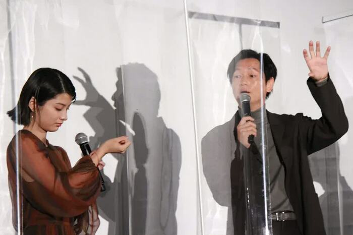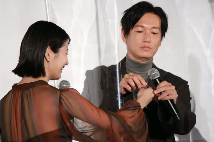 また、イベントでは父親役を演じた井浦が娘役の蒔田にサプライズでプレゼントを渡す場面も。井浦が、「父から娘へ。出雲式の勾玉(まがたま)をプレゼントしたいと思います」と、蒔田の腕に勾玉の付いたブレスレットをつけてあげると、うれしそうに観客に披露。