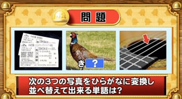 次は、シャッフル写真問題。次の3つの写真をひらがなに変換し、並べ替えて出来る単語は何でしょうか?