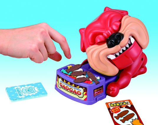 ひいたカードの指示に従って居眠りしているガオガオを起こさないように、そ~っとエサ皿の中のエサを順番にとっていき、運悪くガオガオが飛び出して襲われてしまった人の負けです。