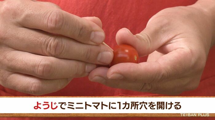まず下準備として、ミニトマトのヘタを取りつまようじで1カ所穴をあけます。こうすることで、トマトの水分による油ハネが防げます。