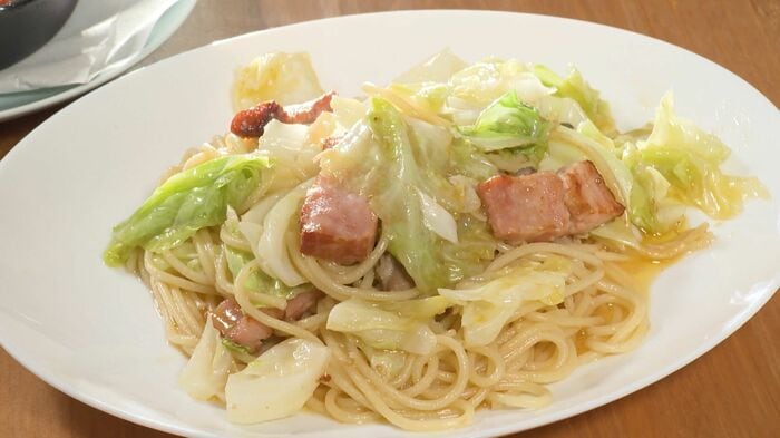 ・スパゲッティ 320g、ベーコンスライス 150g、ざく切りキャベツ 1/3個分、刻みニンニク 1片分