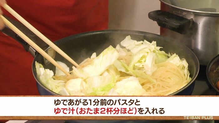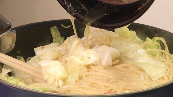 ベーコンを加え焼き目がついたら、キャベツを加えてさらに炒め、ゆで汁をお玉2杯ほど入れ、そこに、ゆで上がる1分前のパスタを加えます。