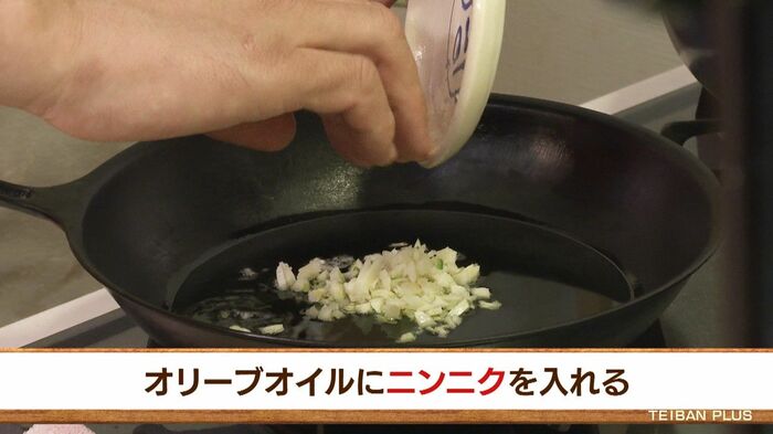 下準備ができたら、フライパンでオリーブオイルを加熱し、ニンニクのみじん切りを入れます。