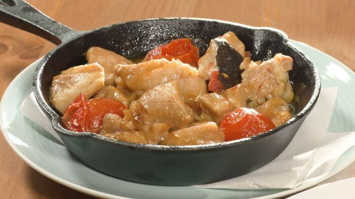 ニンニクの香りが立ったら、ミニトマト・下味をつけた鶏肉とエリンギを入れ、オリーブオイルをミニトマトが軽く浸かる程度に加え、油が全体に回るように軽く動かしながら煮込みます。