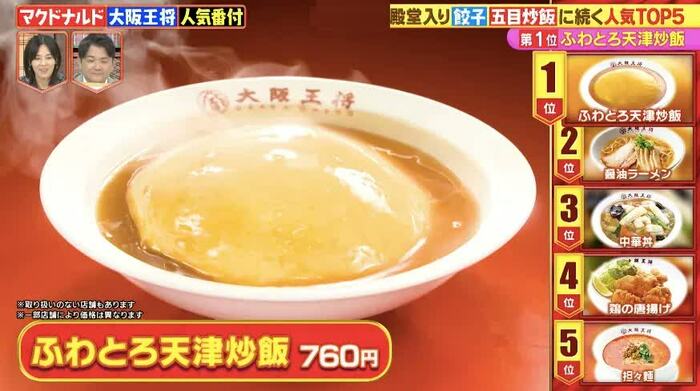 そして1位は、大阪王将名物「ふわとろ天津炒飯」がゲット!企業秘密の「ふわとろの素」を卵に加えて、フワッフワの食感を実現している。