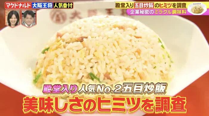 また、同じく殿堂入りの「五目炒飯」の美味しさの秘密は、大阪王将が独自開発した炒飯専用熟成ミンチ。これを使えば、誰でも「大阪王将」の味を再現できるミラクル調味料。肉のふっくら感は、熱風&蒸気を同時に放出して調理することで実現しているという。