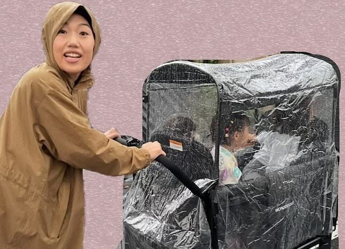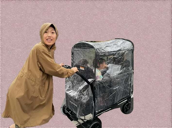 写真を見ると、黄土色のレインコートを羽織り、3人の子供が乗った黒の大きなベビーカーを押す横澤さんの姿が!ベビーカーには、透明のフィルムが全面にかけられています。雨にぬれずに外の景色が見えるため、乗っている子供たちは前のめりになるなど、どこか楽しそうですね♪