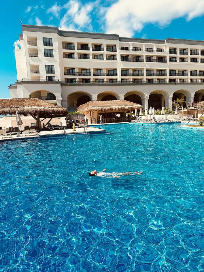 「青い海、照りつける太陽」というコメントと共に、透き通るプールに浮かぶ様子や、白い砂浜を歩く絶景ショットを複数枚公開。