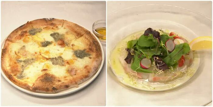 濃厚なチーズの風味が人気のクアトロフォルマッジオPIZZA(2200円)は、ハチミツをふりかけて食べるのがオススメ。ほか、真鯛のカルパッチョ(1000円)、すっきり檸檬のハイボール(500円)で乾杯。※すべて税別