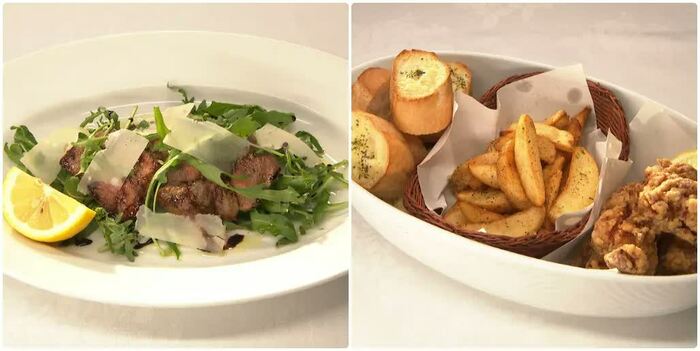 黒毛和牛のイチボを贅沢に使用した、黒毛和牛のタリアータ(2300円)は、レアな焼き加減が肉好きにはたまらない一品。ほか、開拓時代の黒船セット(950円)をいただき、甘いお酒が大好きというフワちゃんとカシスオレンジ(600円)で乾杯。※すべて税別