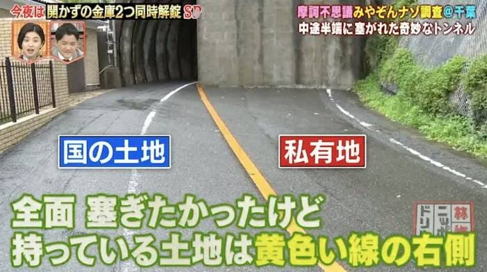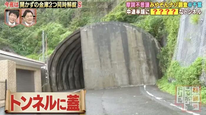 まず登場したのは、入り口の3分の2くらいがコンクリートで塞がれているトンネルの謎だ。トンネルの入口まで続いている普通の道路が、突如途切れる形になっている。