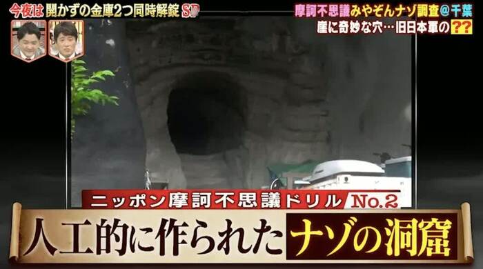 続いてみやぞんが向かったのは、同じ富津市内の道路脇にある、中途半端な高さにくり抜かれた謎の洞窟だ。洞窟の入り口はコンクリートで補強されており、少々急だが上り下り可能な階段もあるので、明らかに人が作ったものだということがわかる。誰が何のために作った洞窟なのか。