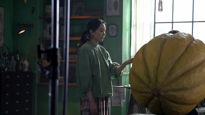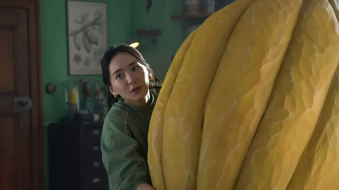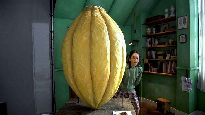 新垣結衣が抱える、黄色い巨大なオブジェとは…?実はこれ、10月15日から全国で順次オンエアする明治「チョコレート効果」の新CM撮影での一コマで、抱えるのは、全長130センチのカカオの形をしたオブジェ。