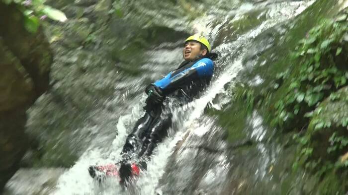 2日目は、渓流で行うアウトドアスポーツ・キャニオニングへGO!ウエットスーツに着替えたメンバーは、森の中へ進み川にできた天然のウォータースライダーを滑ったり、高さ6mの岩からダイブしたりと東京とは思えない大自然を満喫。