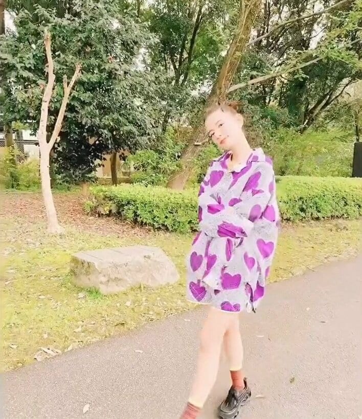 紫の大きなハートがいくつも描かれたミニ丈ボトムスとトップスのセットアップのようなものを着て、緑豊かな場所でお散歩をしているような様子も。