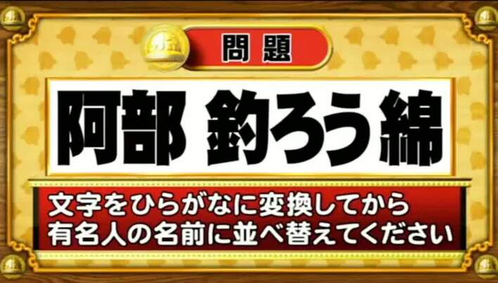 最初は「脳ミングアップクイズ」から、シャッフル人名の問題。次の文字をひらがなに変換してから、ある有名人の名前に並べ替えよ。