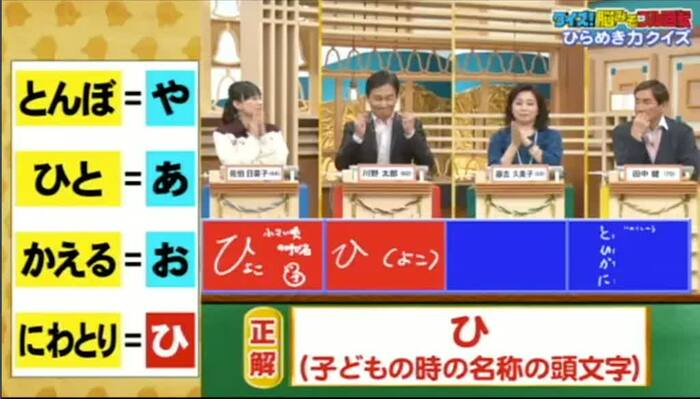正解は、ひよこ「ひ(子どもの時の名称の頭文字)」。佐伯と川野が見事正解!
