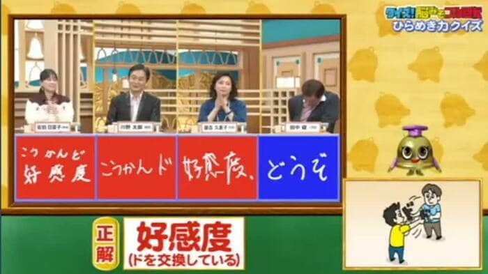 正解は「好感度(『ド』を交換している)」。佐伯、川野、藤吉の3人が見事正解!