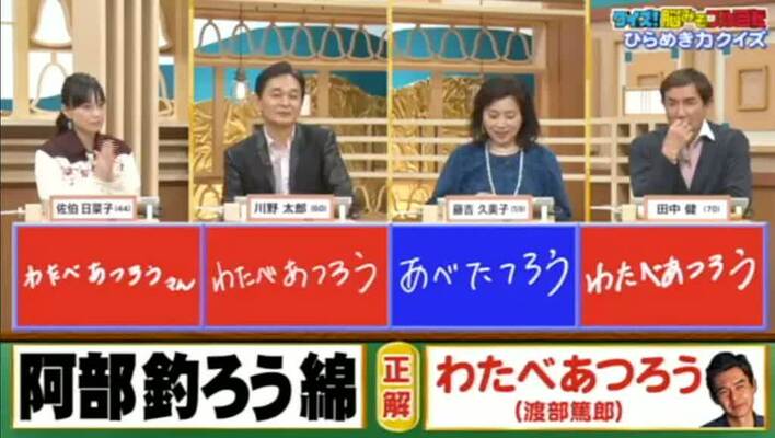 正解は「わたべあつろう(渡部篤郎)」。佐伯、川野、田中の3人が正解。