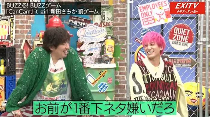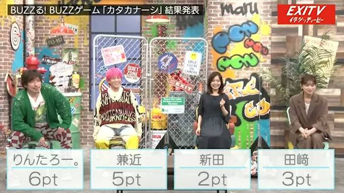 「カタカナのお題をカタカナ語を使わずに説明」して当ててもらうというゲームで得点を競っていく。ゲームはワイワイと大いに盛り上がり、結果はりんたろー。が1位、兼近が2位と、若者の新田と田﨑を寄せ付けずに圧勝。最下位となった新田には罰ゲームとして「アラサーEXITからおじさん文化を伝授」ということで、兼近から「サークルの集まりとかで席に座るときに使えるフレーズ」をレクチャーされる。