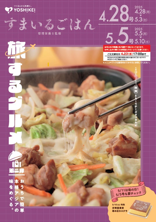 つくる人から笑顔に。をテーマに全国でミールキット宅配サービスを提供するヨシケイグループ(本部所在地:静岡県静岡市 / 代表取締役: 平野 圭吾)は、メニューブック『すまいるごはん』4/21号、4/28・5/5合併号の3週にわたり「旅するグルメ」特集を展開、第一弾の4/21号では、北海道・青森・岐阜・長崎・沖縄のご当地グルメを再現できるミールキットを発売しました。続く第二弾の4/28・5/5合併号では韓国・中国・タイのご当地グルメのミールキットを発売、自宅で手軽にアジアのグルメをお楽しみください。