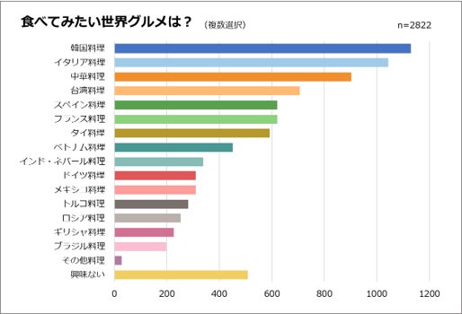 具体的に作って食べてみたい世界グルメに関しては、全体の約40%の人が韓国料理を選択、ほかアジアの国々も上位にランクインしています。