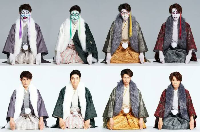 隈取・所作監修の市川蔦之助は、ふぉ~ゆ~のキャラクターとそれぞれのメンバーカラーを踏まえて、斬新な隈取をデザイン。本人たちもテンションを大いに上げてビジュアル撮影に臨んだという。