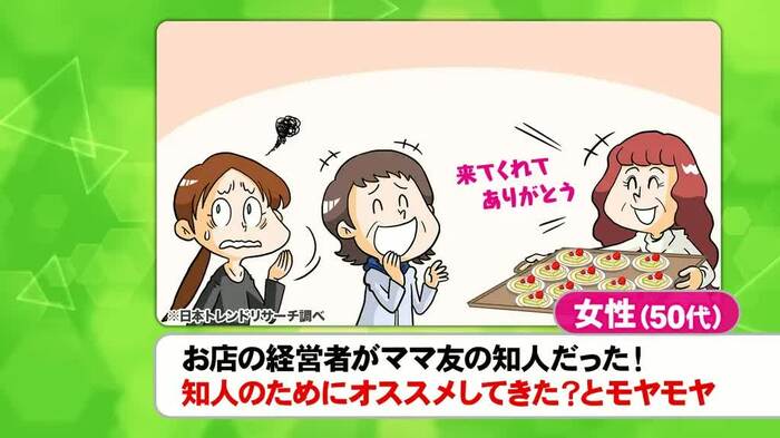 「人のおすすめにどこまで左右される?」というテーマでは、「スイーツ好きのママ友が紹介してくれたお店に行ったのだが、ママ友の知人が経営者だった。知人のためだったのかとモヤモヤする」という50代女性のエピソードが登場した。