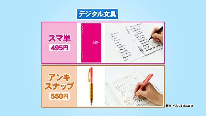 「スマ単」は、専用のノートに単語を書いて撮影するだけで、自動的にスマホ上に単語帳を作成。「アンキスナップ」は、暗記したい単語に専用マーカーで線を引いてスマホで撮影すると、その部分が見えなくなるという。