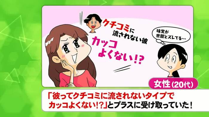 「友達の彼氏はグルメサイトで低評価のレストランばかりデートに選ぶらしいが、友達は『クチコミに流されないタイプ』と喜んでいる」という20代女性のモヤモヤでは、虻川が「彼氏も『クチコミに流されない俺、カッコいいだろ?』って感じなのかな?」と疑問を。