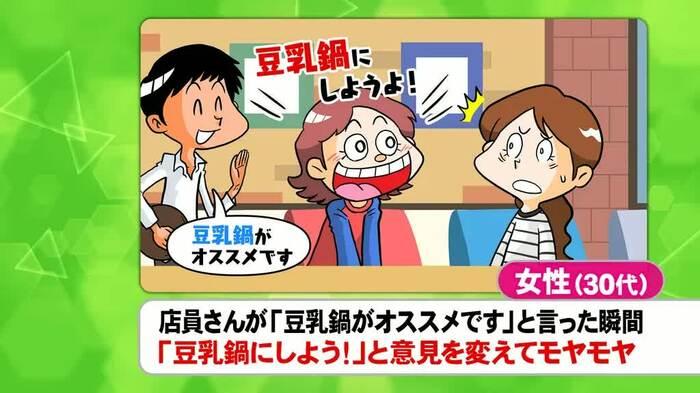 「辛いものを食べたいとキムチ鍋を食べに行ったのに、友達が店員から勧められた豆乳鍋を食べたいと言い始めてモヤモヤした」という30代女性のエピソードも。