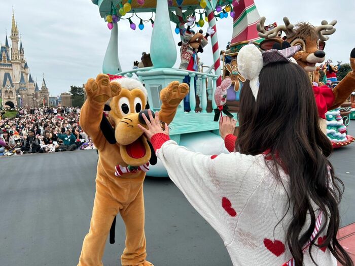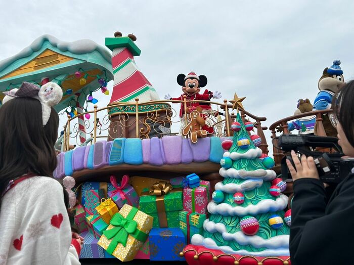 林キャスターが東京ディズニーランドのパーク内に入って体験したのは、ディズニーとピクサーキャラクターが大切な人たちと一緒に過ごすクリスマスの物語を綴ったパレード「ディズニー・クリスマス・ストーリーズ“フォンド・フェアウェル”」。