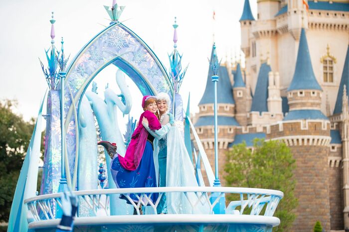 雪の結晶がデザインされたフロートに乗って登場したのは、アナとエルサ。