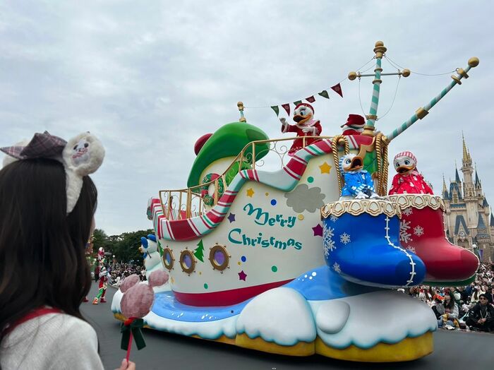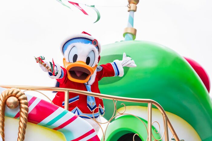 サンタクロースに扮したドナルドダックが、デイジーダックやヒューイ、デューイ、ルーイたちと一緒に楽しい時間を過ごす物語からパレードは始まります。
