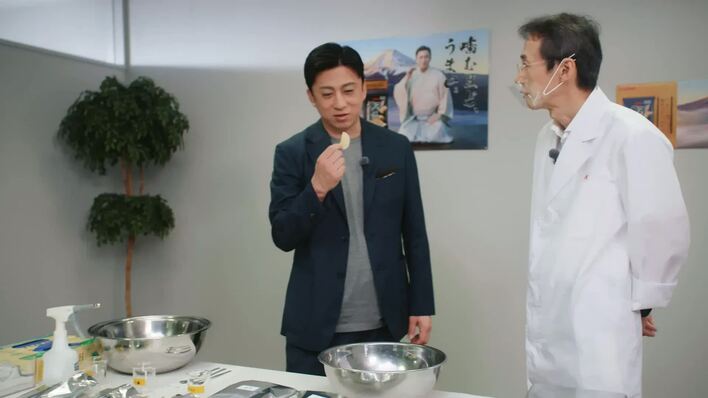 カルビーの研究所に到着した幸四郎は、さっそく開発者と対面。まず、味付け体験をすることに。4種類の形状のポテトチップと3種類ののり味が用意される中、味のついていないポテトチップを手に取り味見すると「おいしいですね」と自然と笑顔がこぼれる。