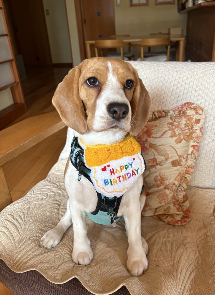 ソファの上にちょこんと座るビーグルの「ふて」ちゃんは1歳の女の子。