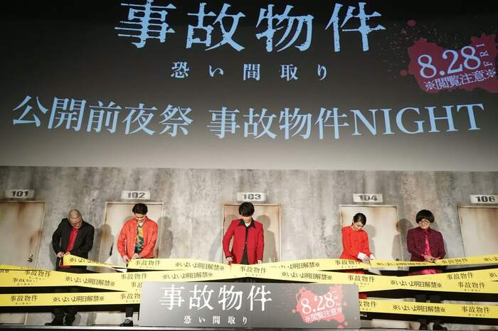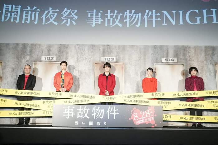 8月27日(木)、映画「事故物件 恐い間取り」(8月28日公開)の公開前夜祭舞台挨拶“事故物件NIGHT”が開催され、出演者の亀梨和也、奈緒、瀬戸康史と中田秀夫監督、原作者の松原タニシが登壇した。
