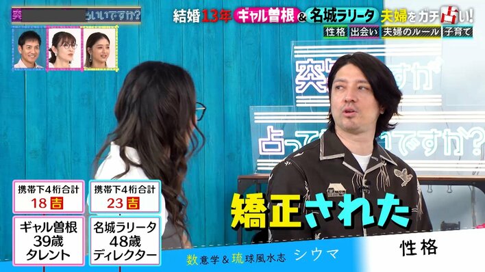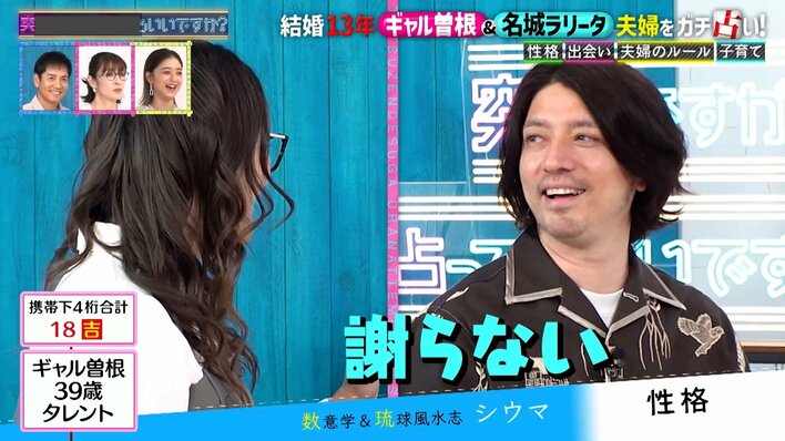 気を取り直し、シウマさんはギャル曽根さんについて「人間関係は狭く深く。謝るのが好きじゃない」と鑑定。「そう?」と首を傾げるギャル曽根さんに、ラリータさんが「まぁ…謝らないです」と苦笑いするなど、夫婦ならではの仲の良さを見せました。
