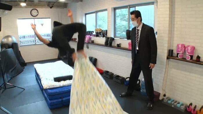 三面刑事の前でも難なく布団かぶりを見せた豊村さん。そもそもバク転を始めたきっかけは豊村さんが14歳の頃に見た映画だったという。