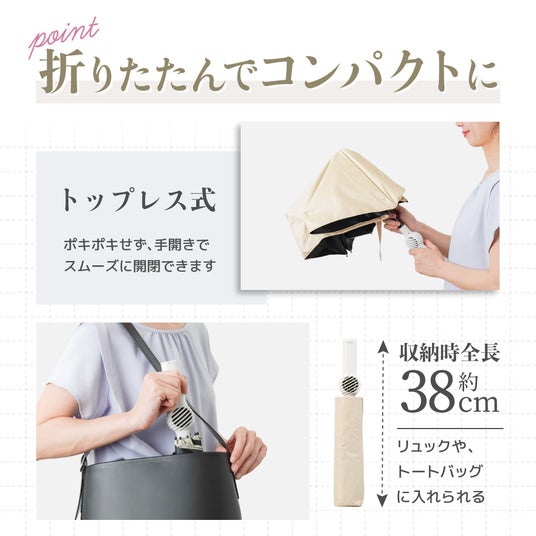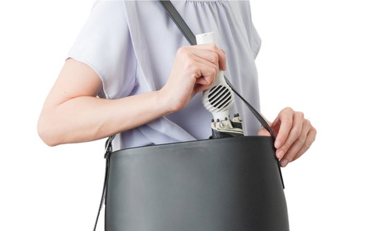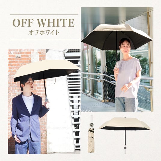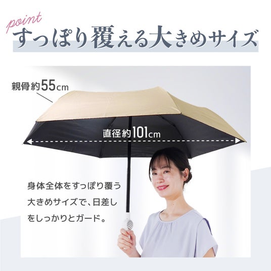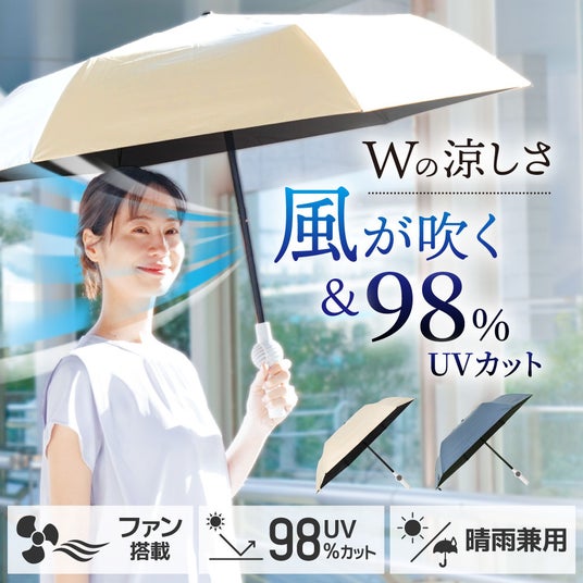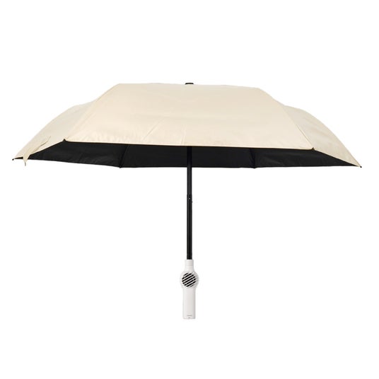 シャフトから吹く風で顔まわり涼しく。扇風機付き折りたたみ日傘で快適に外出できる