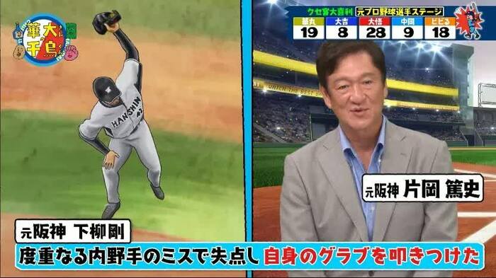 「なんでこのものまねがわかんないのよ!わかるでしょ、ほら。若手が2回エラーしたときの、下柳(剛)のグローブの叩きつけ方よ!」 (大悟)