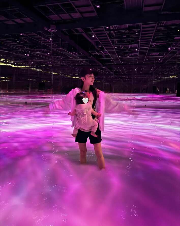 長女と次女は、2人お揃いの服と髪型で、幻想的な空間を楽しむ様子を見せ、キラキラとピンク色に輝く装飾の前で寄り添いピースをする姿などを披露しています。