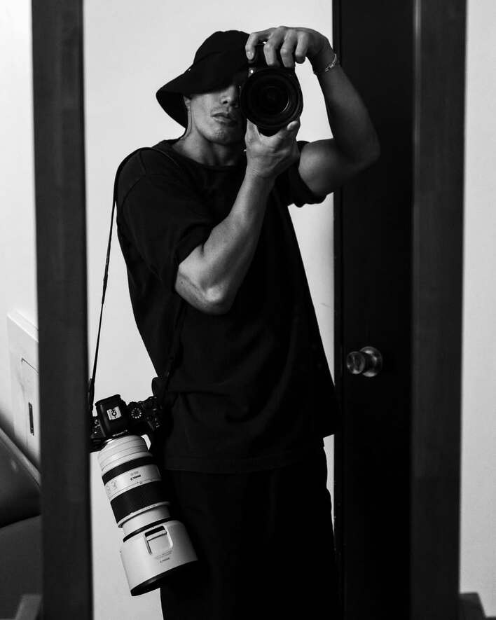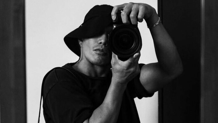 カメラを支えるボコっと盛り上がった腕の筋肉もモノクロの写真が際立たせています。