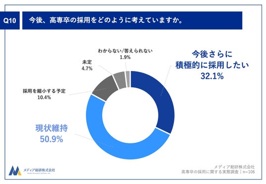 「Q10.今後、高専卒の採用をどのように考えていますか。」(n=106)と質問したところ、「今後さらに積極的に採用したい」が32.1%、「現状維持」が50.9%という回答となりました。