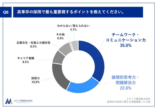 「Q6.高専卒の採用で最も重要視するポイントを教えてください。」(n=106)と質問したところ、「チームワーク・コミュニケーション力」が35.0%、「論理的思考力・問題解決力」が22.6%という回答となりました。