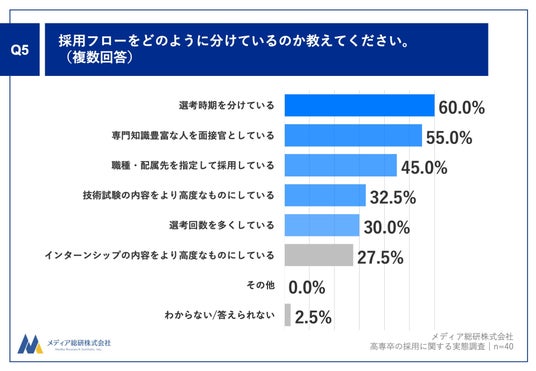 Q4で「採用フローも担当部署も分けている」「採用フローは異なるが担当部署は同じ」と回答した方に、「Q5.採用フローをどのように分けているのか教えてください。(複数回答)」(n=40)と質問したところ、「選考時期を分けている」が60.0%、「専門知識豊富な人を面接官としている」が55.0%、「職種・配属先を指定して採用している」が45.0%という回答となりました。