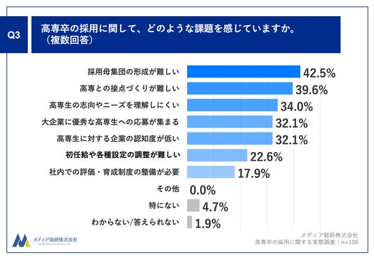 - 02|高専卒採用の課題、「採用母集団の形成が難しい」(42.5%)や「高専との接点づくりが難しい」(39.6%)など