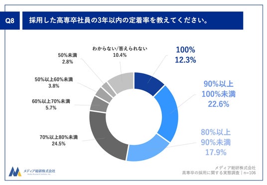「Q8.採用した高専卒社員の3年以内の定着率を教えてください。」(n=106)と質問したところ、「100%」が12.3%、「90%以上100%未満」が22.6%、「80%以上90%未満」が17.9%という回答となりました。