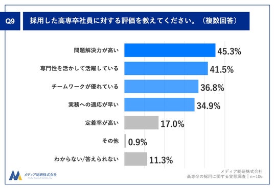 「Q9.採用した高専卒社員に対する評価を教えてください。(複数回答)」(n=106)と質問したところ、「問題解決力が高い」が45.3%、「専門性を活かして活躍している」が41.5%、「チームワークが優れている」が36.8%という回答となりました。